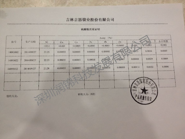 作 用:吉恩硫酸鎳主要用于高端電鍍,電子電鍍,化學鍍,高端鋰電池三元材料,高端鎳氫電池材料及高純試劑等用途。