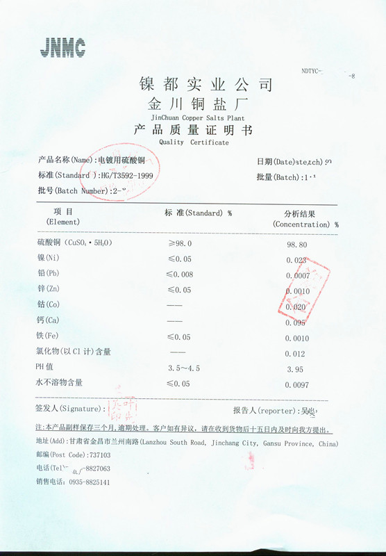 簡介:金川硫酸銅,主要用于電鍍銅、化學鍍銅;化學工業中是制取其它銅鹽的重要原料,用于制造染料、媒染料劑、顏料、防腐劑、農藥。
