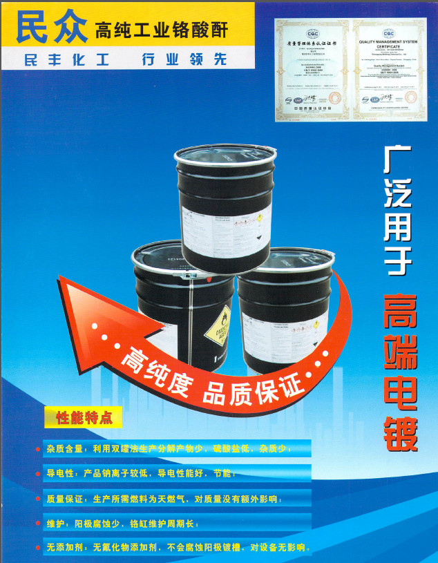 作    用:主要用于鍍鉻槽主鹽使用和塑膠電鍍前處理粗化槽使用,純度高,雜質低,硫酸根低,為市場廣泛接受品牌。