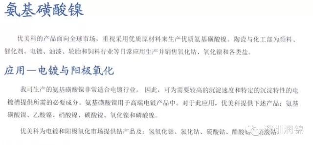 我公司作為優美科氨基磺酸鎳中國地區特級代理商,現倉庫有充足優美科氨基磺酸鎳,可滿足廣大客戶在鍍鎳工藝上的需求。歡迎有需求的客戶朋友與業務員洽談訂貨,我們期待您的來電和光臨!
